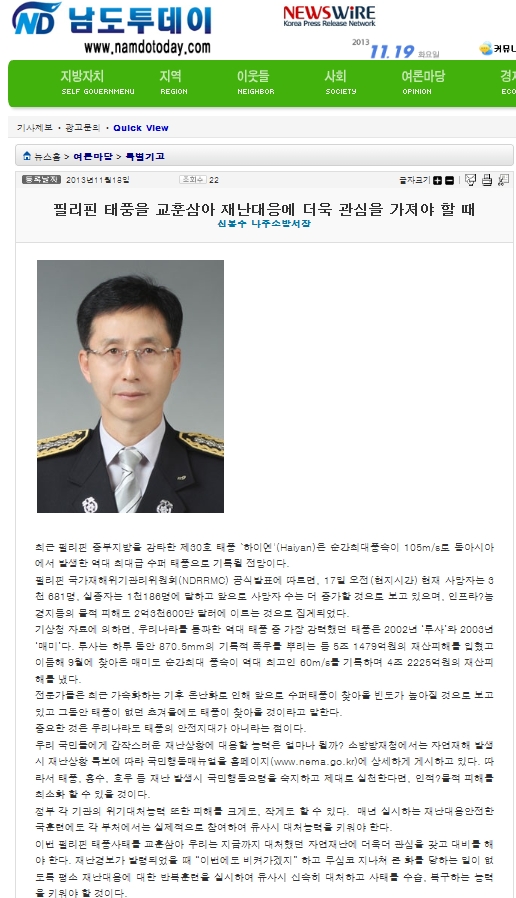 [기고] 나주소방서장, 필리핀 태풍 교훈삼아 재난대응에 관심을..